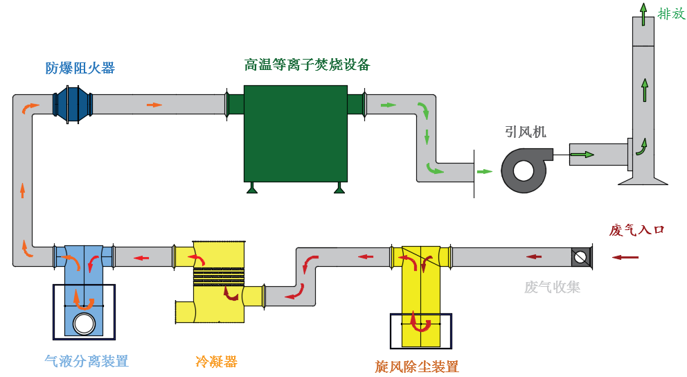 经高温等离子焚烧处理,工业废气中有机物(VOCs)裂解成为碳、二氧化碳、水蒸气等单质物质。